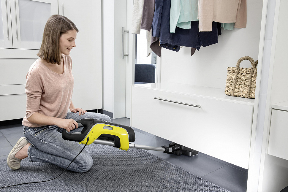 Давайте вспомним о нашем первом впечатлении, о пылесосе Karcher VC 5 Premium касательно его габаритов. Нам казалось, что пылесос массивен и возможно даже неповоротлив. Тем не менее, ознакомившись с ним более детально, мы понимаем, что пылесос VC 5 Premium очень удобен в эксплуатации и хранении во время, когда мы его не используем. Это достигается применением телескопической ножки, которая способна увеличить или уменьшить высоту пылесоса вдвое. Стоит отметить, что пылесос Karcher VC 5 Premium имеет достаточно массивный корпус, но развернув тонкую телескопическую ножку, мы сможем проникнуть даже в самые недоступные ранее места нашего жилища. Очень просто производится уборка даже под кроватью или под шкафом, где ранее было очень много, пыли и её никто не убирал.